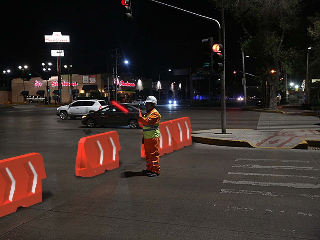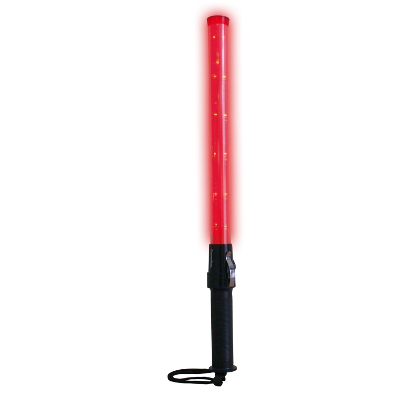 Bastón utilizado en obras viales o reparaciones para advertir y desviar el tránsito vehícular. Luz roja de leds con dos funciones: fija o intermitente. Clip para sujetar al cinturón y cinta para muñeca