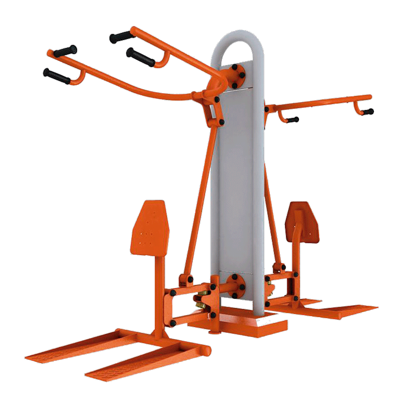 Toda una línea de gimnasios al aire libre y accesorios deportivos. Equipos individuales o estructuras multi-usuarios. Gran variedad de opciones para el estiramiento y fortalecimiento muscular. El poste es de acero zincado y pintura al horno. Pedales fabricados con acero prensado. Manillares fabricados con PVC. Embellecedores de aluminio. Efecto superficie a escoger entre liso o rugoso.