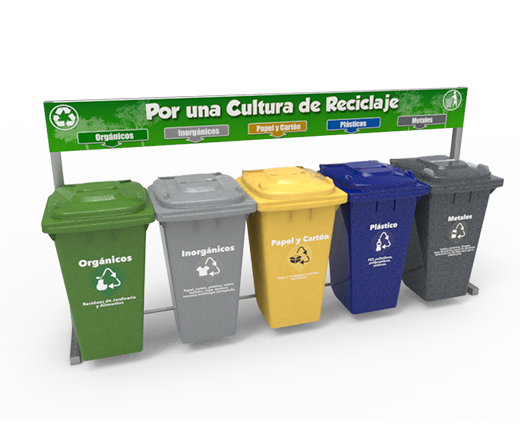 La ESTACIÓN DE RECICLAJE cuenta con una combinación de contenedores VIC-240HD, fabricado con polietileno de alta densidad, reuniendo las más altas condiciones de fluidez, gran resistencia a golpes o roturas. Su producción es mediante el proceso de inyección, lo que permite fabricar todo el cuerpo en una sola pieza, sin partes remachadas, esto ayuda a evitar puntos de tensión o fragilidad.